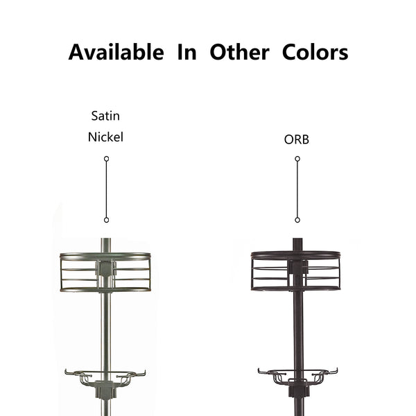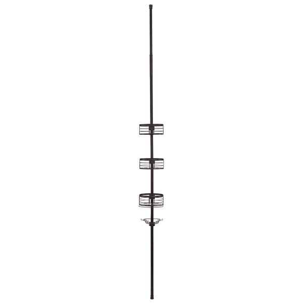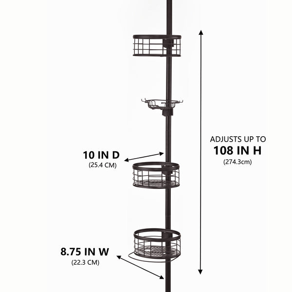 Tension Pole Shower Caddy organizes your everyday bath items and includes space on its 3 shelves (baskets) for large and inverted bottles. This rust-resistant shower caddy conveniently fits in any unused corner in your shower and provides a soap dish and an integrated towel holder, too. The caddy uses balanced tension technology for easy, no-tools installation and adjusts to fit shower spaces up to 9 feet tall. The round baskets adjust up and down the pole and can be removed for easy cleaning. Built-in hooks create additional hanging storage for body poufs and loofahs.
