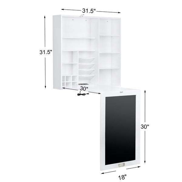 Loft97 SH71WWE Collapsible Fold Down Desk Table with Storage Cabinet & Shelves - Wall Mounted Desk Furniture with Chalkboard Wall - Computer Desk Storage with USB Charging Ports & Outlets - White