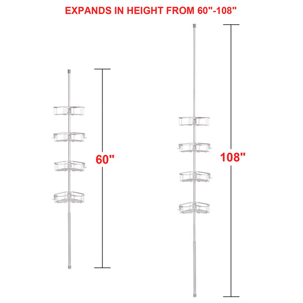- PERFECT STORAGE SPACE - With adjustable and removable shelves! Easily adjust and cut the bar to fit heights of up to 5' or less and maximize your shower space. This heavy-duty corner tension pole shower caddy comes with four adjustable and removable shelves with drainage slots. The size of this pole is 60-108" tall and the baskets measure 11.6" in length x 7.6" in depth x 3" in height, making it the perfect size for all your shower essentials.