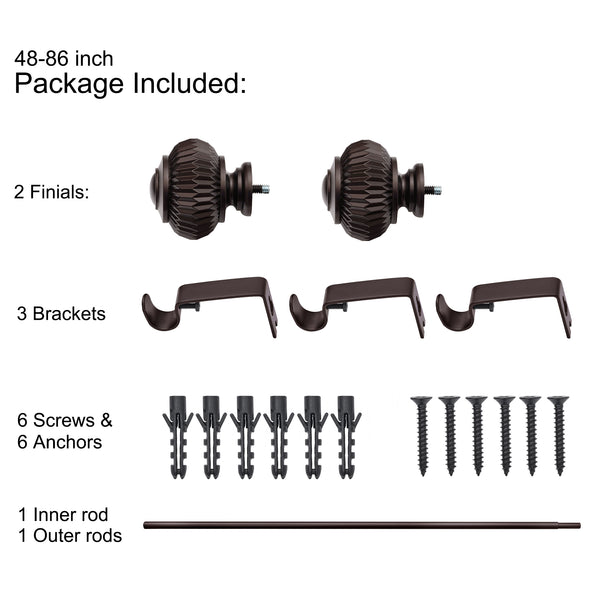 48-86" includes 2 finials, 3 brackets, 1 inner rod, 1 outer rod, 6 screws & 6 anchors.
