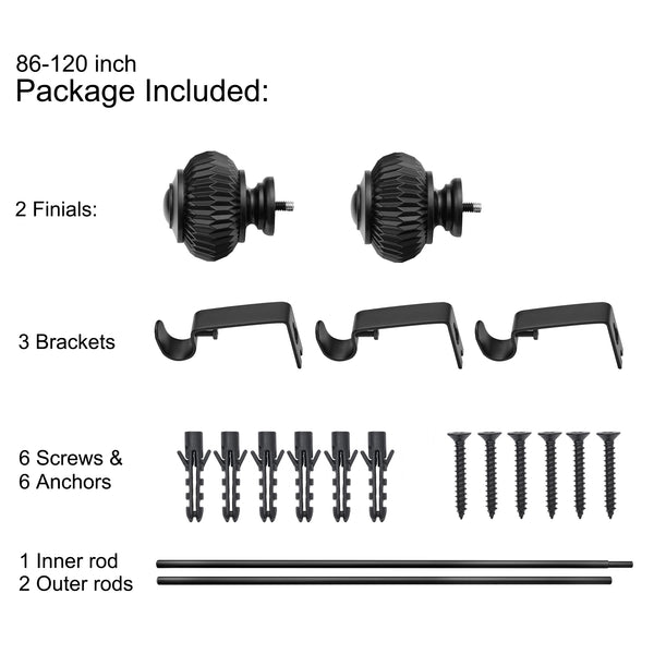 86-120" includes 2 finials, 3 brackets, 1 inner rod, 2 outer rods, 6 screws & 6 anchor.
